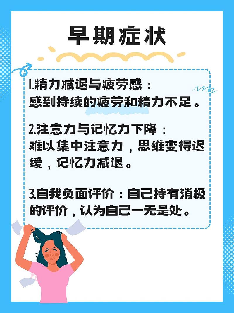 小贴士:重度抑郁症的早期症状可能并不十分明显,但随着时间的推移,这些症状会逐渐加重并对患者的日常生活造成严重影响。
